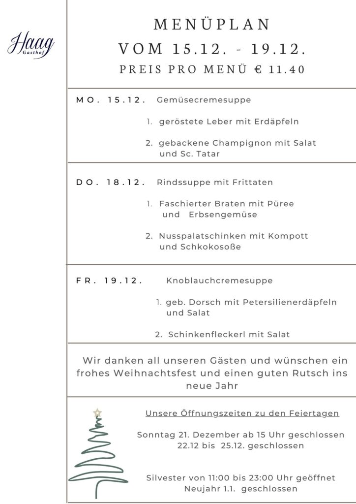 zurückMenüplan und Speisekarte Hier finden Sie unseren wöchentlichen Menüplan und darunter die aktuelle Speisekarte Menüplan vom 15.12. – 19 .12. Unsere Empfehlungskarte März 14, 2024Dezember 6, 2025