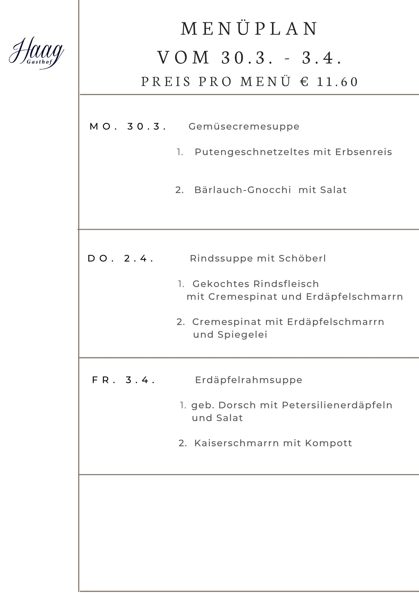 zurückMenüplan und Speisekarte Hier finden Sie unseren wöchentlichen Menüplan und darunter die aktuelle Speisekarte Menüplan vom 30.3. – 3.4. Unsere Empfehlungskarte März 14, 2024März 13, 2026